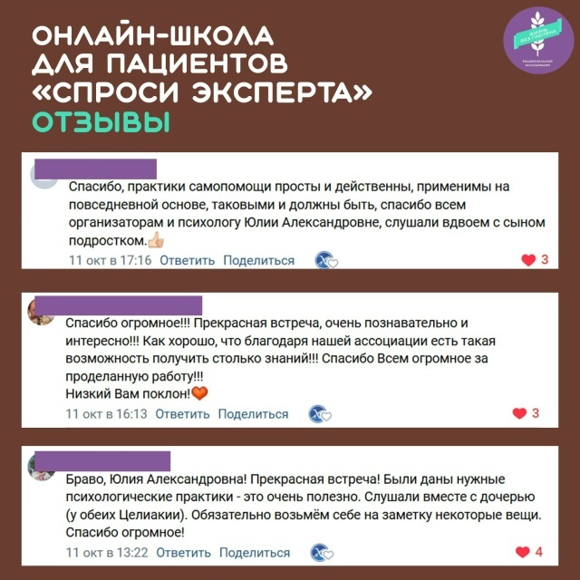 В субботу 11 октября, в рамках Онлайн-школы для пациентов "СПРОСИ ЭКСПЕРТА" состоялась интерактивная встреча членов ассоциации "Жизнь без глютена" с экспертом, клиническим психологом, Юлией Александровной Поповой; ассистировала на встрече Алиса Дмитриевна Редькина, студентка 4 курса направления "психология".
