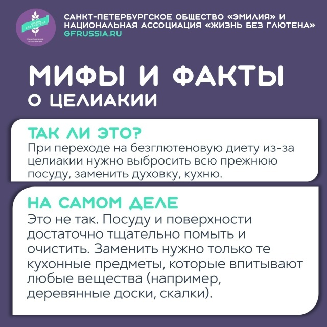 Возможно, вы слышали такое мнение, что "при переходе на безглютеновую диету из-за целиакии на кухне нужно заменить всю технику и посуду". Так ли это? Отвечаем на слайде.