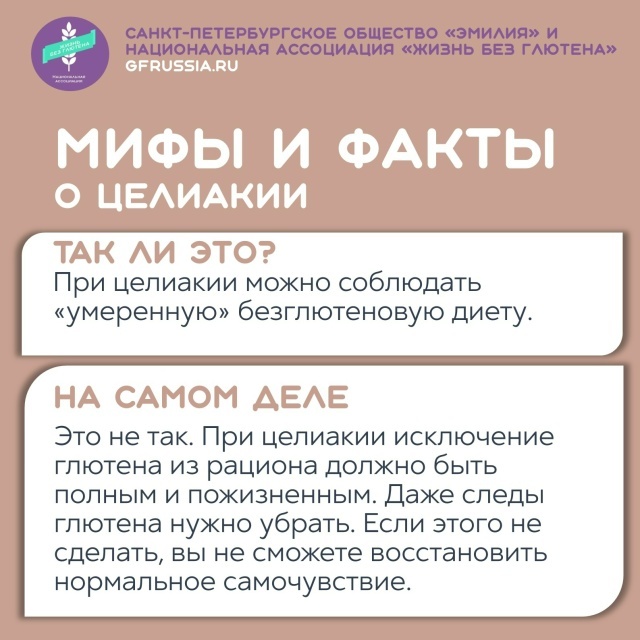 Сегодня снова о мифах и фактах о целиакии. Наверняка вы слышали такое мнение, что "при целиакии можно соблюдать "умеренную" безглютеновую диету". Так ли это? Отвечаем на слайде.