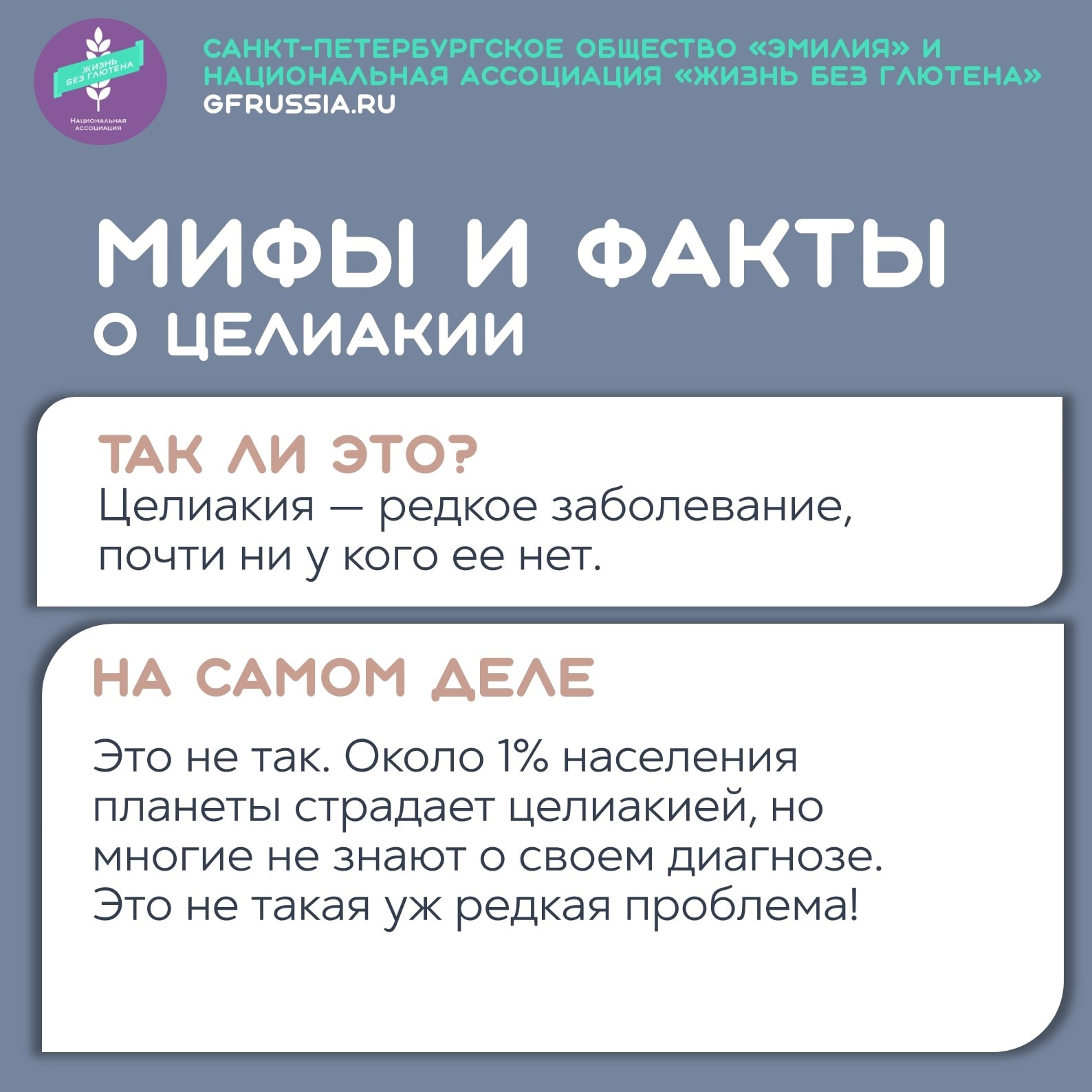 Сегодня разбираем очередной миф о целиакии. Наверняка вы сталкивались с мнением, что "целиакия - очень редкое заболевание, почти ни у кого ее нет". Так ли это? Отвечаем на слайде.