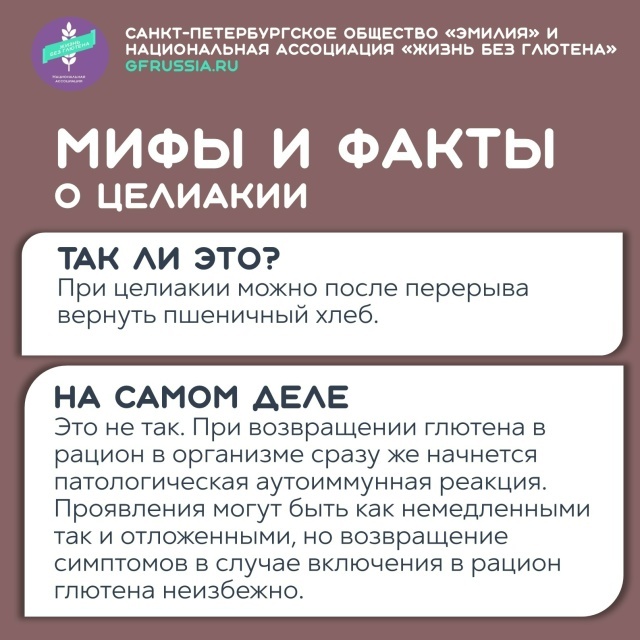 Наверняка вы слышали такое мнение, что "при целиакии можно после перерыва вернуть пшеничный хлеб". Действительно ли можно так поступить? Отвечаем на слайде.