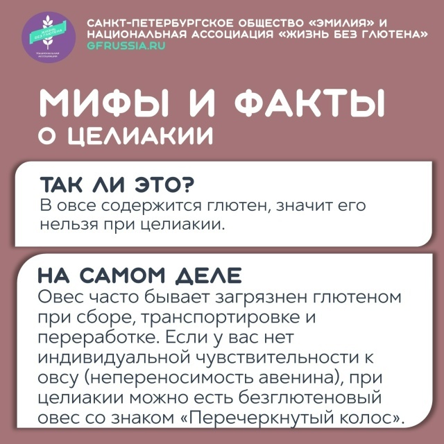Разбираем мнение, что "при целиакии нельзя овес, так как в нем содержится глютен". Так ли это? Отвечаем на слайде. А также рекомендуем почитать наш пост про глютен в овсе тут: vk.ru/wall-79124850_1437.